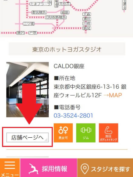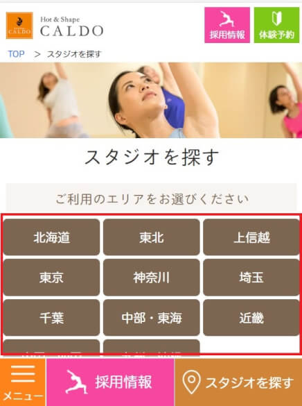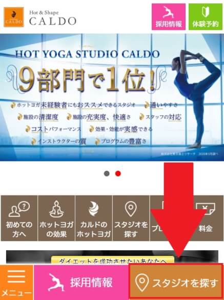 ↓PCの場合は「画面上」の「スタジオを探す」から各教室のサイトに飛べます。画面下のほうのスタジオを探すからは飛べないので注意してください。
