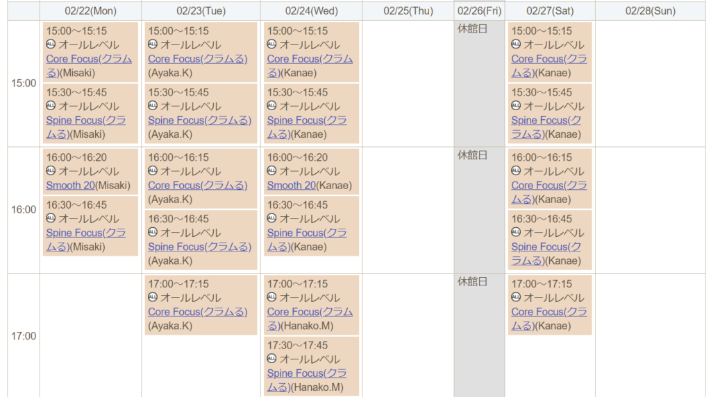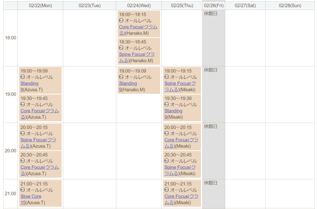 上のレッスン名を見るとわかりますが、レッスン名からレッスン内容がわかりません…。強度はどのくらいなのか?どこに効果があるのか?どんな人が受けるべきなのか?受けてみないとどんなレッスンなのかわからないのは、改善してほしいです。