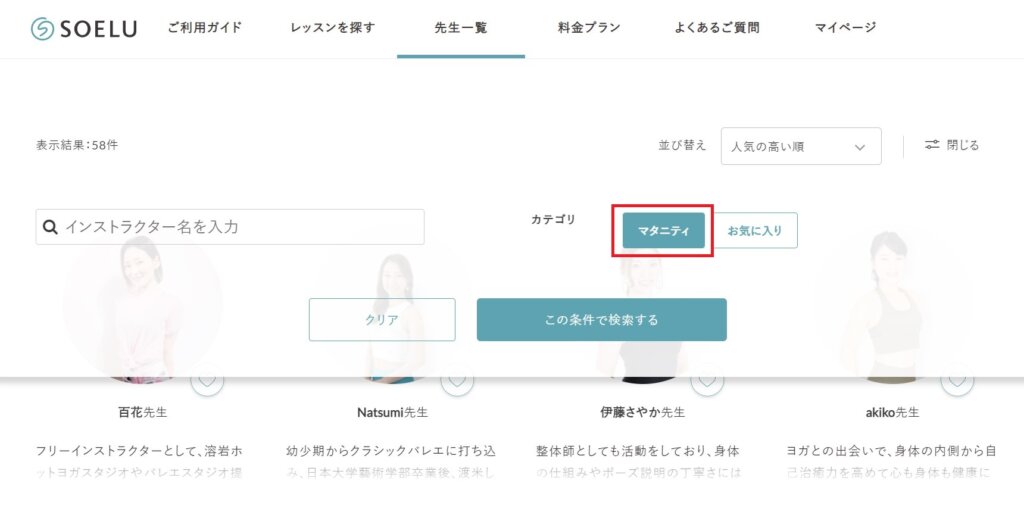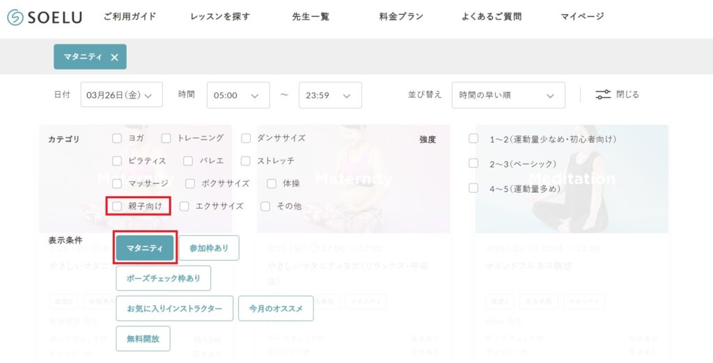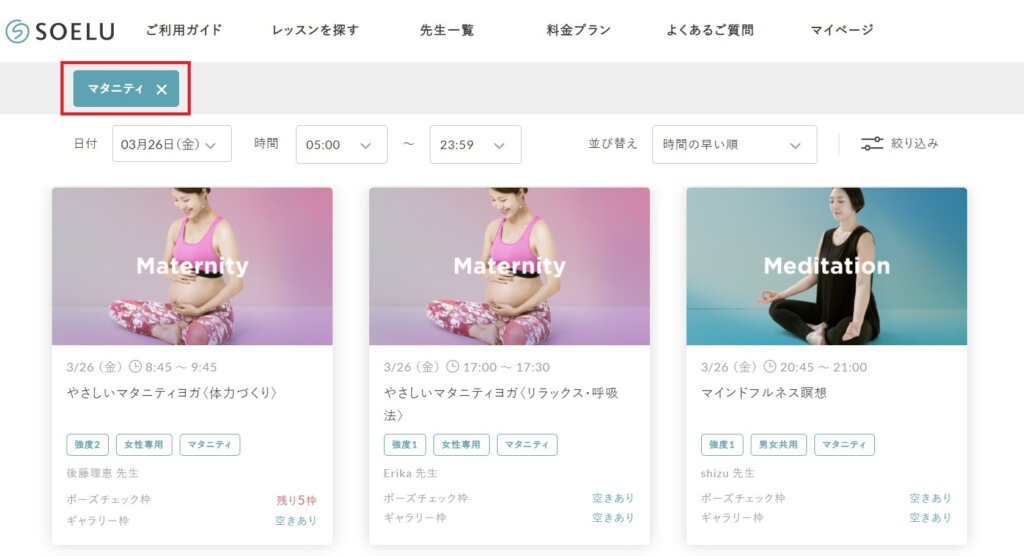 SOELU(ソエル)はレッスンを検索する際に、色々な条件で絞り込むことができます。もちろん「マタニティ」で絞り込むことも可能。
