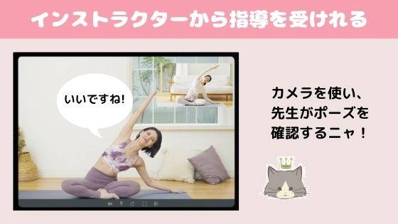 - 指導ありのライブレッスン:インストラクターが映像を通してレッスン生のポーズを確認し指導してもらいながらレッスンできる。