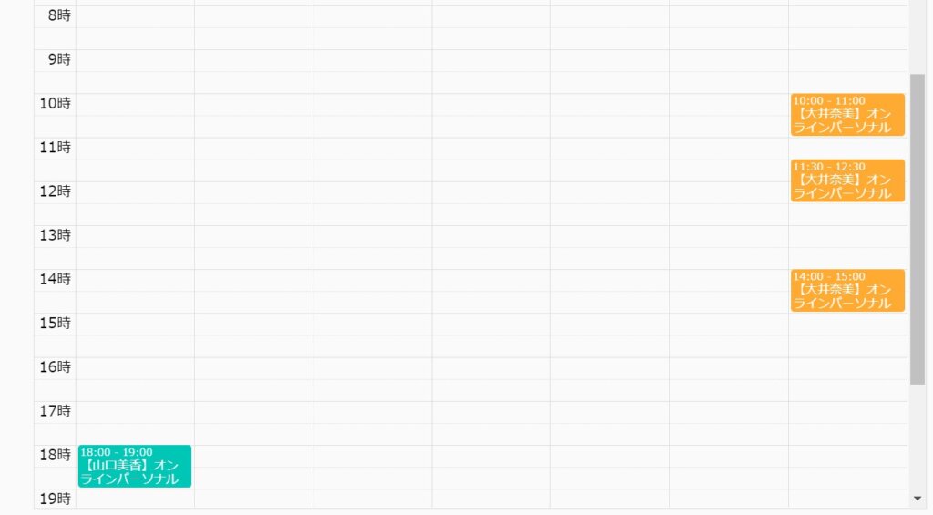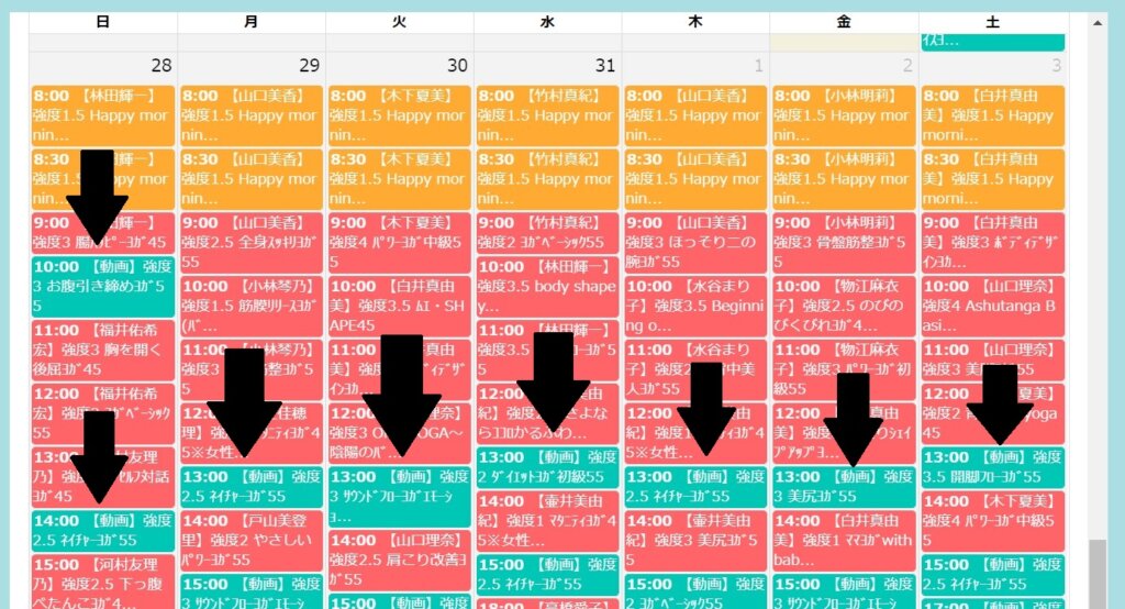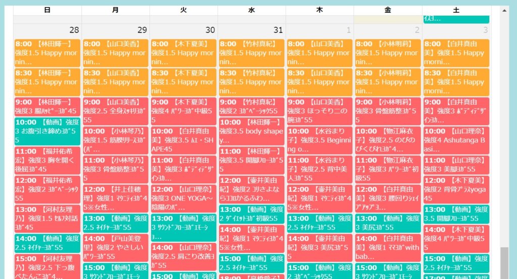 それに、うちヨガ+のグループレッスンとパーソナルレッスンのカレンダーを見ても、パーソナルレッスンしか表示されません。月会費のグループレッスンは予約できるのに…。